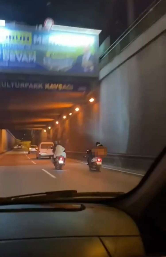 Bir süre bu şekilde giden motosiklet sürücüsü, hem kendinin canını hem de trafiği tehlikeye attığından habersiz gözden kayboldu. Yaşanan bu anlar ise, bir vatandaşın cep telefonu kamerasına yansıdı.
