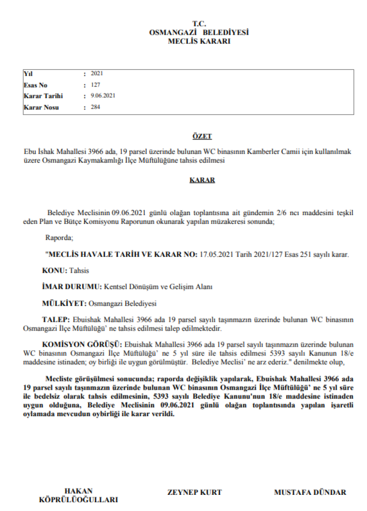 9 Haziran 2021 tarihinde belediye meclisinde yapılan oylamada, tuvalet binasının 5 yıl süre ile bedelsiz olarak Osmangazi İlçe Müftülüğüne tahsis edilmesine karar verilmişti.