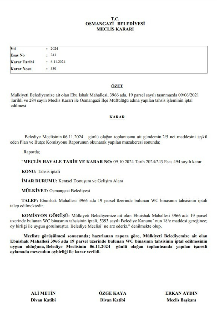 Kasım ayı meclis toplantısında, Ebuishak Mahallesi 3966 ada 19 parsel üzerinde bulunan tuvalet binasının Osmangazi İlçe Müftülüğüne tahsisinin iptali talebi görüşüldü.