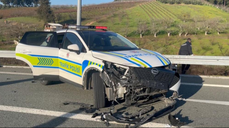 Bu esnada trafik polis aracına çarpan otomobil kontrolü kaybedip refüjdeki aydınlatma direğine çarptı.