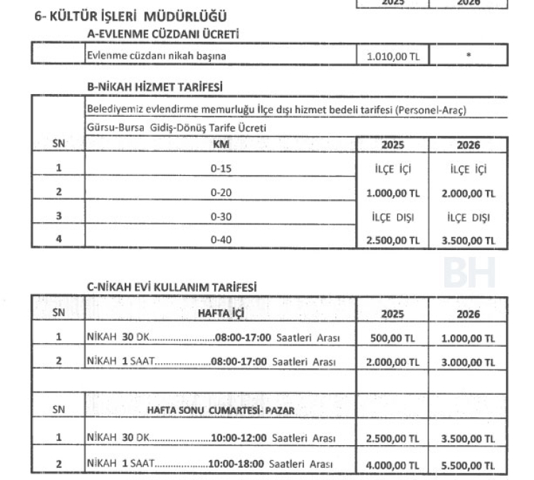 İşte Gürsu Belediyesi'nin 2026 yılı nikah ücretleri...