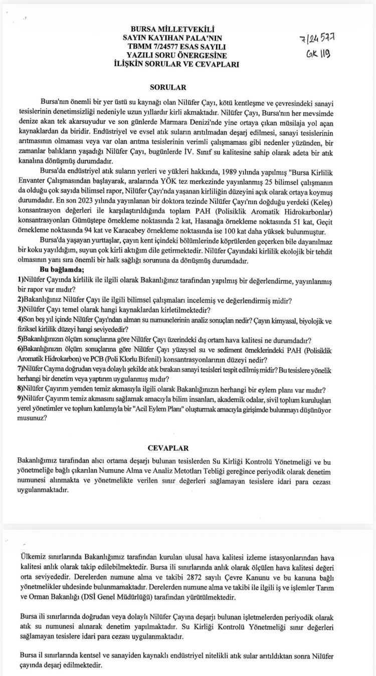 Bursa’nın en önemli su kaynaklarından biri olan Nilüfer Çayı’ndaki kirlilik, Türkiye Büyük Millet Meclisi (TBMM) gündemine taşındı. Cumhuriyet Halk Partisi (CHP) Bursa Milletvekili Prof. Dr. Kayıhan Pala’nın verdiği soru önergesine Çevre, Şehircilik ve İklim Değişikliği Bakanlığı’ndan yanıt geldi.