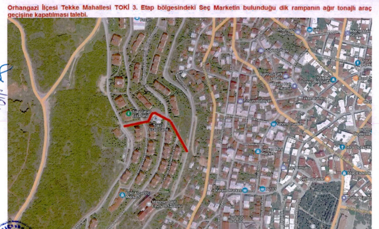 Orhangazi Tekke Mahallesi’nde TOKİ 3. Etap bölgesinde bulunan dik rampada, ağır tonajlı araçların geçişine izin verilmeyecek.