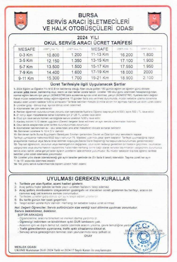 Bursa'da 2024 Eğitim Öğretim yılında geçerli olmak üzere okul servisi fiyatlarına zam geldi. İşte en yakın ve en uzun mesafe okul servis ücretleri…