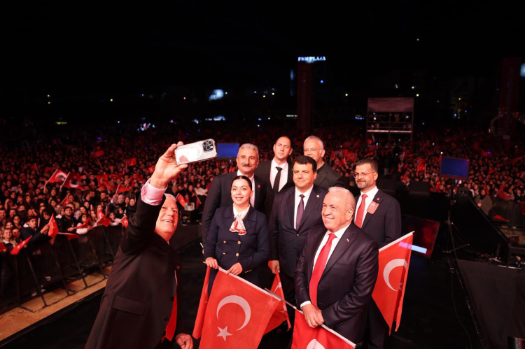 Nilüfer Belediye Başkanı Şadi Özdemir de sahneye eşi Nuray Özdemir ile çıkarak Cumhuriyet Bayramı konuşmasını yaptı. Alandaki sesin, coşkunun ve atan kalplerin Cumhuriyet’in sesi olduğunu söyleyen Başkan Şadi Özdemir, marşın her yıl biraz daha umutlu, biraz daha gür yankılandığını belirtti. Bu marşın, bir milletin ayağa kalkışının, bir halkın özgürlük tutkusunun marşı olduğunu vurgulayan Başkan Şadi Özdemir, "Biz o tutkunun neferleriyiz. Mustafa Kemal’in askerleriyiz. Nilüfer’de, Bursa’da, Türkiye’nin her yerinde Cumhuriyet’in ışığında, Ata’mızın yolunda yürüyen yürekli insanlarız. Bugün 102 yıllık bir mirası kutluyoruz. Bu mirası geleceğe taşıyoruz. Çünkü biz inanıyoruz ki: ancak Cumhuriyet varsa, gelecek var. Bugün, bir milletin küllerinden doğduğu o büyük günün yıl dönümündeyiz. Bugün, karanlıktan aydınlığa uzanan bir inancın, bir direnişin izindeyiz. Cumhuriyetimizin 102. yılı kutlu olsun. Bayramımız kutlu olsun" diye konuştu.