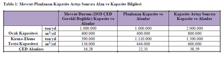 1.000.000 olan ocak kapasitesinin 2.000.000 ton/yıl’a, kırma-eleme tesisi kapasitesinin ise 390.000 ton/yıl’dan 1.500.000 ton/yıl’a çıkarılması hedefleniyordu.