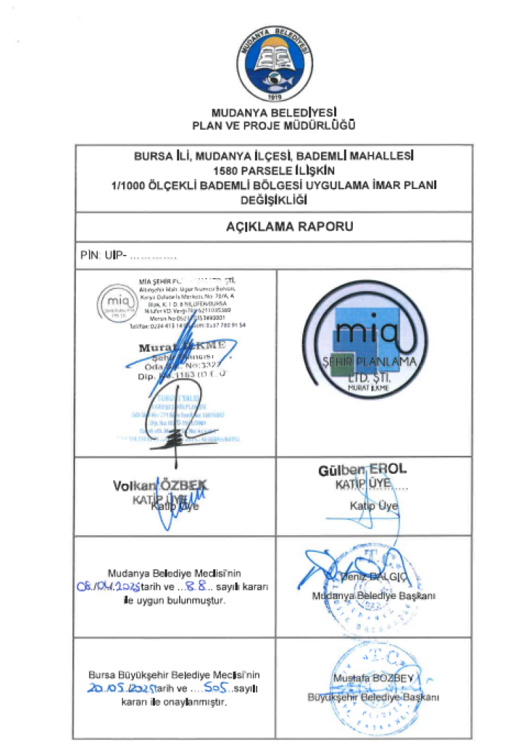Yapılan açıklamada, "Bursa İli, Mudanya İlçesi, Bademli Mahallesi 1580 parsele ilişkin 1/1000 Ölçekli Bademli Bölgesi Uygulama İmar Planı Değişikliği 3194 sayılı İmar Kanunu'nun 8/b maddesine göre Mudanya Belediye Meclisi'nin 08.04.2025 tarih ve 2025 /88 sayılı kararı ile uygun bulunmuş Bursa Büyükşehir Belediyesi Meclisi'nin 20.05.2025 tarih ve 505 sayılı kararı ile onaylanmış olup Mekansal Planlar Yönetmeliği'nin 33. maddesine istinaden 14.07.2025 tarih tarihinden itibaren belediyemiz internet sitesi ile Plan ve Proje Müdürlüğü'nde 1 (bir) ay süre ile askıya çıkarılmıştır." ifadeleri kullanıldı.