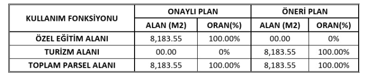 Plan açıklama raporuna göre söz konusu parsel, mevcut imar planlarında “Özel Eğitim Alanı” olarak yer alıyordu. Yapılan değişiklikle alanın fonksiyonu “Turizm Alanı”na dönüştürüldü. Raporda çevrede ilkokul, ortaokul ve özel eğitim alanlarının bulunması nedeniyle yeni bir eğitim alanı ihtiyacı olmadığı, bu nedenle fonksiyon değişikliğinin sosyal donatı dengesini olumsuz etkilemeyeceği belirtildi.
