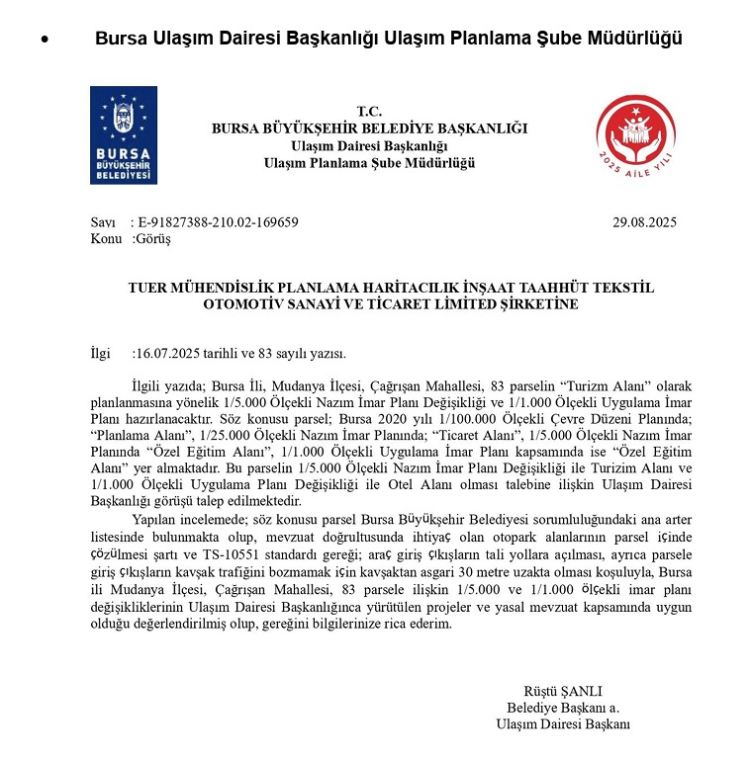 Bursa Büyükşehir Belediyesi Ulaşım Dairesi Başkanlığı’nın görüş yazısında, plan değişikliğinin otel alanı talebine ilişkin hazırlandığına dikkat çekildi. Yazıda, parselin ana arter listesinde yer aldığı belirtilerek otopark ihtiyacının parsel içinde çözülmesi, araç giriş-çıkışlarının ana yollara bağlanması ve kavşaklara en az 30 metre mesafede düzenlenmesi şartı getirildi. Bu detay, bölgede otel projesi ihtimalini güçlendiren unsurlar arasında değerlendiriliyor.