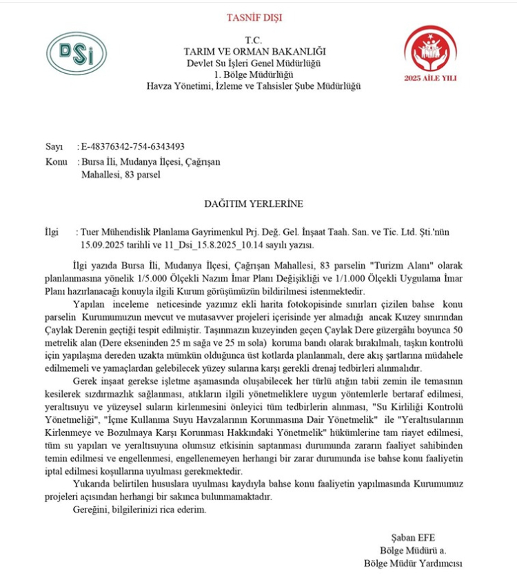 Devlet Su İşleri 1. Bölge Müdürlüğü’nün görüşünde ise parselin kuzeyinden Çaylak Deresi’nin geçtiği vurgulandı. Dere boyunca 25 metre sağ ve 25 metre sol olmak üzere toplam 50 metrelik kontrol bandı bırakılması, yapılaşmanın dere yatağından uzak planlanması ve su kaynaklarının korunmasına yönelik önlemler alınması gerektiği ifade edildi. Ayrıca atıkların yeraltı sularına karışmaması için ilgili yönetmeliklere uyulması istendi.