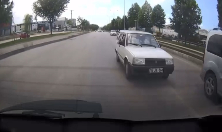 Bursa'da sürücüsünün makas attığı otomobilin, üç aracın arasından hızla geçerek yaptığı tehlikeli manevra, başka bir aracın kamerasına yansıdı.