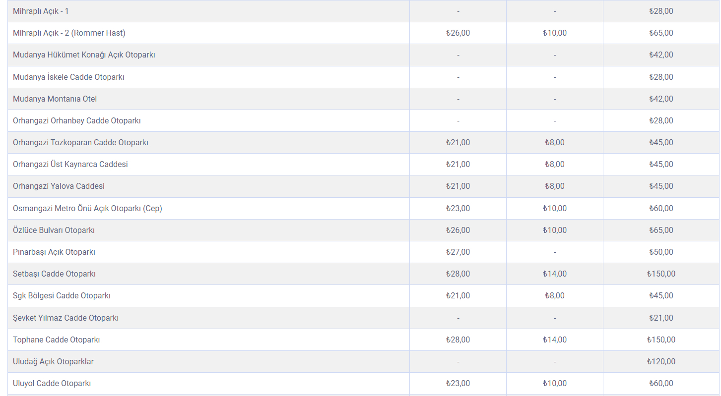 Bursa'da ulaşıma dün yapılan büyük zammın ardından şehir genelinde hizmet veren belediyeye ait cadde, açık ve kapalı otopark fiyatlarına da yüzde 40 oranında zam geldi. İşte yeni fiyat tarifesi...