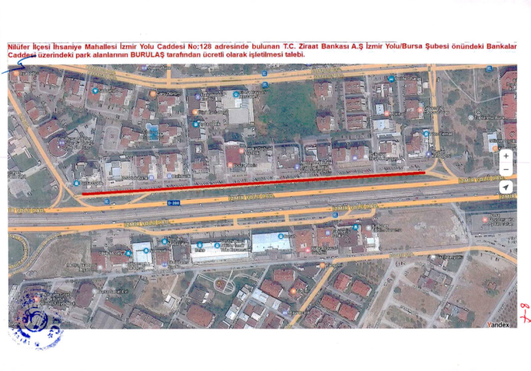 Nilüfer İlçesi İhsaniye Mahallesi İzmir Yolu Caddesi No:128 adresinde bulunan T.C. Ziraat Bankası İzmir Yolu/Bursa Şubesi önündeki yol kenarı park alanlarına ilişkin talep değerlendirildi. Söz konusu bankanın 13 Şubat 2026 tarihli dilekçesi ile BURULAŞ’ın 27 Şubat 2026 tarihli yazısı doğrultusunda bölgede yeni bir düzenlemeye gidildi.