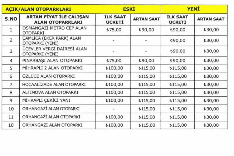Pınarbaşı, Mihraplı, Özlüce, Altınova, Hocaalizade ve Orhangazi alan otoparklarında da ilk saat ücretleri 115 lira olarak güncellendi.