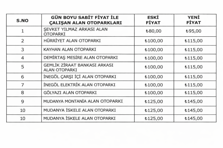 Gün boyu sabit fiyatla hizmet veren Mudanya Dolgu Alanı, Botanik, Hayvanat Bahçesi ve Çukurca kapalı otoparklarında ise ücretler 100 liradan 115 liraya çıkarıldı.