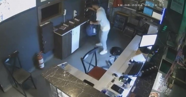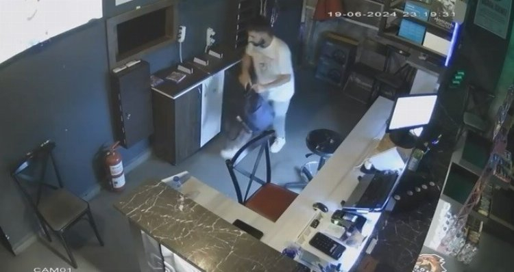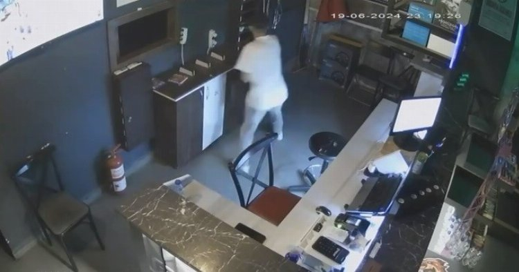 Oyun salonuna giren hırsız önce etrafta kolaçan ettikten sonra, tezgahın arkasına geçti.