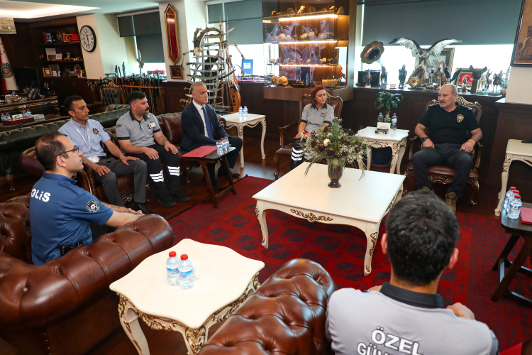 "Özel Güvenlik Haftası" etkinlikleri çerçevesinde Bursa İl Emniyet Müdürü Sabit Akın Zaimoğlu, İl Emniyet Müdür Yardımcısı Erşat Kabasakal, Özel Güvenlik Şube Müdürü Fatih Akyol ve özel güvenlik görevlilerini makamında kabul etti.
