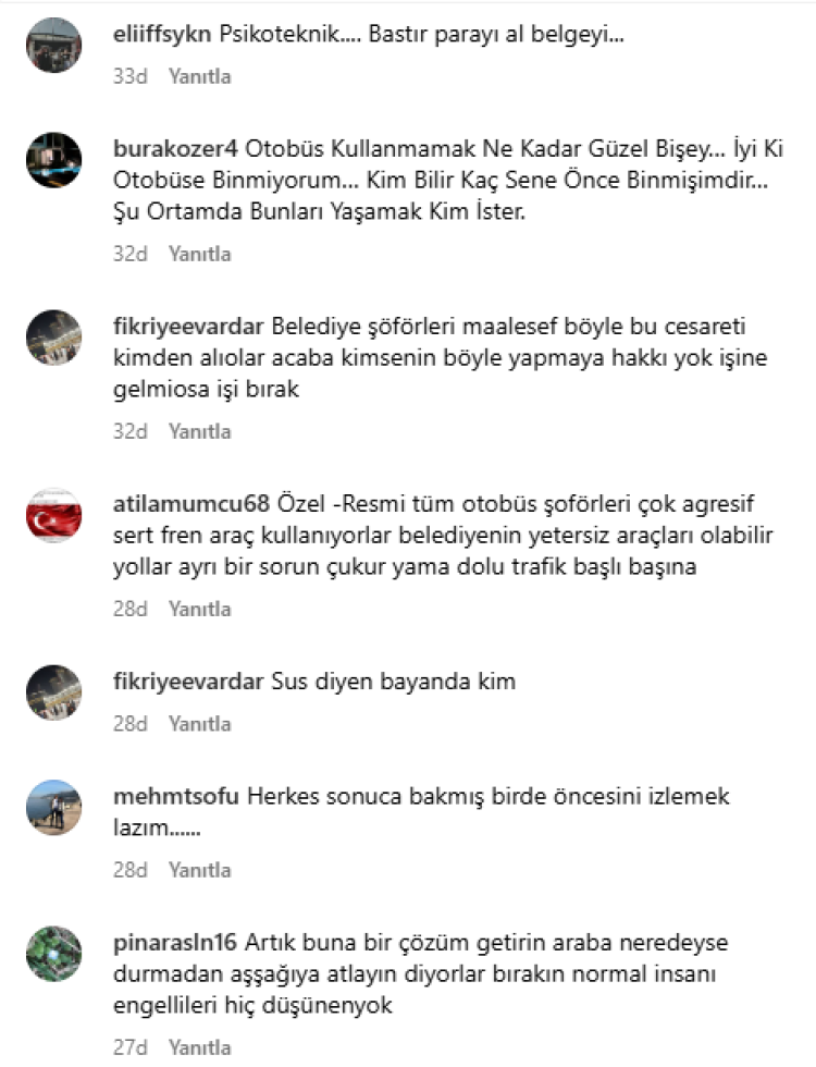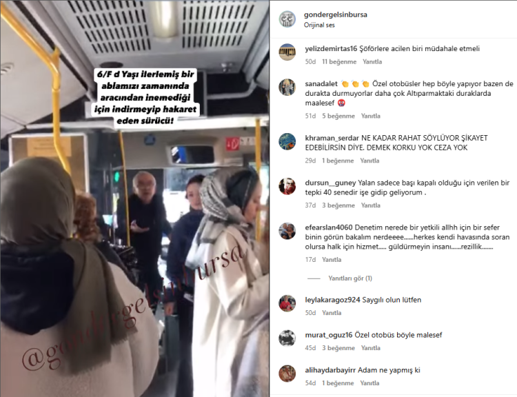 Gönder Gelsin Bursa'nın paylaştığı gönderide, "Çekirge Devlet Hastanesi durağı olay yeri! Sinirli sürücü yaşı ile alakalı olarak ağır hareket eden bir ablamızı hastane durağında indirmeyerek Dikkaldırım Durağı’nda indirmiş. Üstelik araç sürücüsü koltuğundan kalkarak vatandaşın üzerine yürümüş! Bu üzücü duruma müdahil olan yolculara da atar yapmış araç sürücüsü! Biri psikoteknik mi dedi?" ifadeleri kullanıldı.