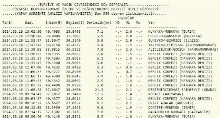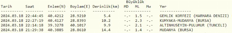 Saat 06.50'de Mudanya Kumyaka'da 1.6 büyüklüğünde, saat 11:05'ten itibaren başlayarak öğle saatlerine kadar Gemlik Körfezi'nde çok sayıda deprem olmuştu.