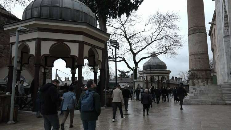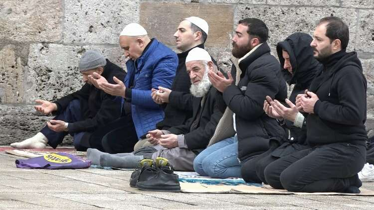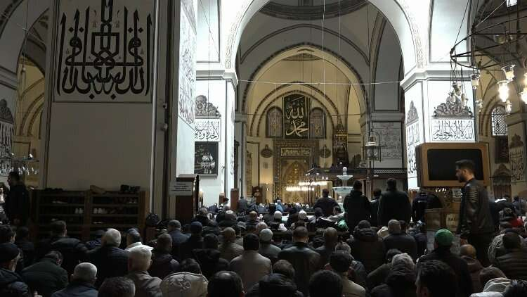Ulu Cami’de namazını kılmak isteyen vatandaşlar ezan vaktinden önce camiye gelmeye başladı. Cami içerisinde yer bulamayan vatandaşlar namazı cami avlusunda kıldı.