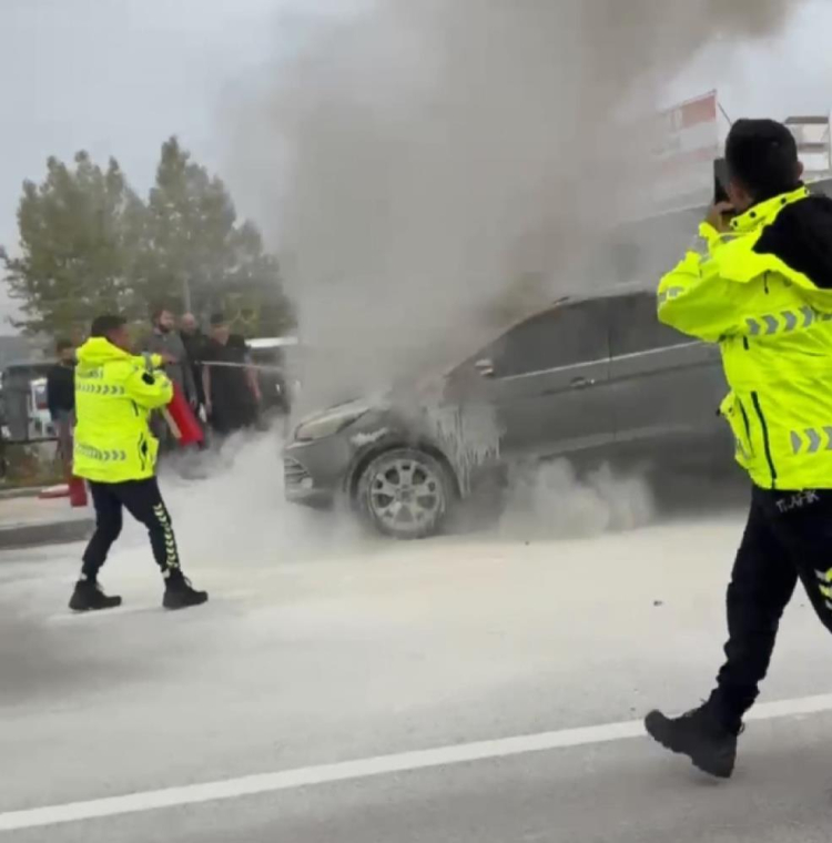 Şans eseri olay yerinden geçen trafik polisleri, yangına yangın tüpleriyle hızlı müdahalede bulundu.