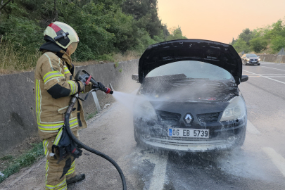 Aracın yandığını gören sürücü, durumu itfaiye ekiplerine bildirdi. Kısa sürede olay yerine gelen ekipler yangını büyümeden söndürdü.