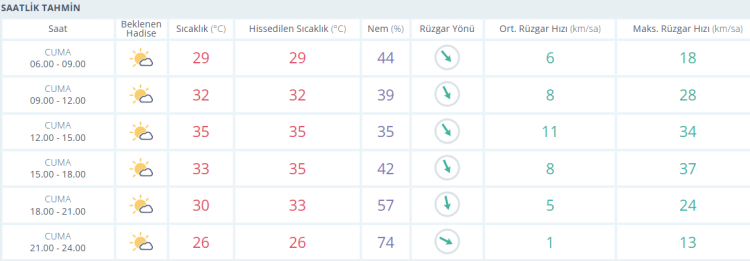 Meteoroloji Genel Müdürlüğü’nün açıkladığı verilere göre gün boyunca güneşli havanın hakim olacağı kentte, sabah saatlerinde 22 derece olan hava sıcaklığı öğle saatlerinde 35 dereceye kadar yükselecek. Akşam saatlerinde ise 30 dereceye, gece saatlerinde ise 26 dereceye kadar düşmesi bekleniyor.