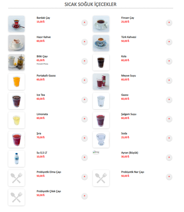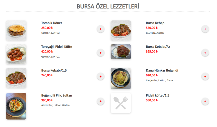 Cantık 90 TL’den 100 TL’ye, kıymalı pide 270 TL’den 320 TL’ye, kuşbaşılı pide 310 TL’den 360 TL’ye, karışık pide 320 TL’den 380 TL’ye, Karacabey soğanlı köy pidesi 250 TL’den 290 TL’ye, günün çorbası 60 TL’den 70 TL’ye, pastırmalı paçanga böreği 170 TL’den 200 TL’ye, ıspanaklı peynirli muska böreği (2 adet) 140 TL’den 170 TL’ye, patates tava/kızartma 90 TL’den 120 TL’ye, enginarlı Bursa pilavı 130 TL’den 150 TL’ye, tombik döner 220 TL’den 250 TL’ye, piliç ızgara 270 TL’den 310 TL’ye, kasap köfte 290 TL’den 340 TL’ye, karışık ızgara 520 TL’den 590 TL’ye, kuzu pirzola 620 TL’den 690 TL’ye, dana hünkar beğendi 540 TL’den 620 TL’ye, Bursa kebabı 490 TL’den 570 TL’ye, 1,5 porsiyon Bursa kebabı ise 670 TL’den 740 TL’ye, Süt helvası 100 TL’den 120 TL’ye, peynir tatlısı 120 TL’den 140 TL’ye, Bursa incir uyutması 130 TL’den 140 TL’ye, frambuaz soslu sıcak browni 190 TL’den 220 TL’ye, kabak tatlısı 140 TL’den 170 TL’ye yükseldi.
