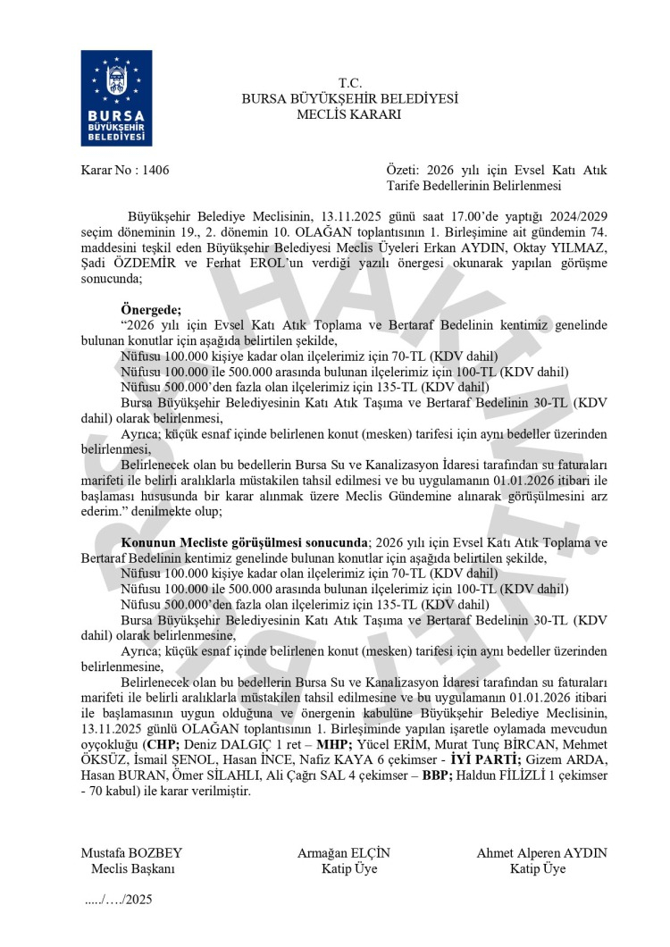 Bursa Büyükşehir Belediyesi, "2026 yılı için Evsel Katı Atık Tarife Bedellerinin Belirlenmesi" için yazılı önerge veren üyelerin isimlerini yayımlamıştı.