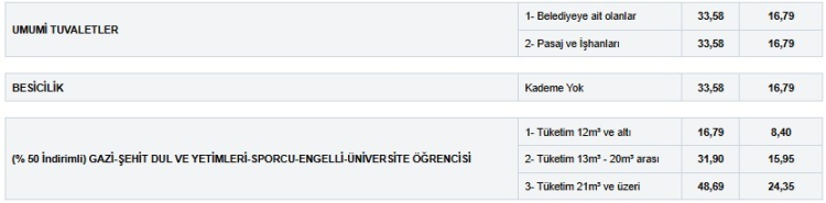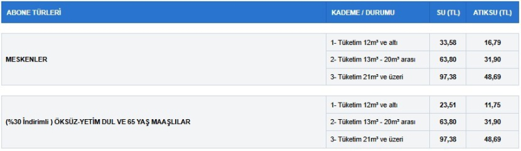 Sene başında 33 lira 28 kuruşa çıkarılan birinci kademe (12 metreküp ve altı) suyun fiyatı 33 lira 58 kuruşa, 16 lira 64 kuruş olan atıksu fiyatı ise 16 lira 79 kuruşa yükseltildi.