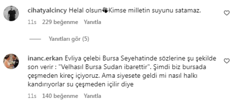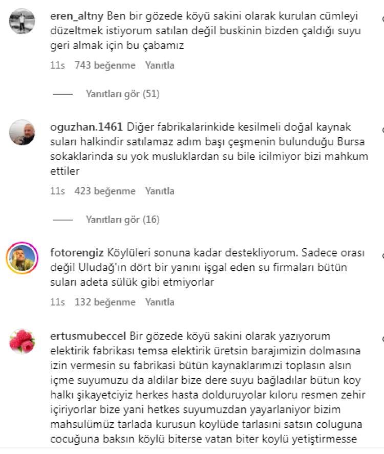 Köy sakini Nurdan Uludağ, “Biz köy halkı olarak muhtarımızın sonuna kadar arkasındayız. Buraya suyumuzu korumak için geldik. Suyumuzu hiçbir yere vermek istemiyoruz. Biz deremizin suyunu değil kendi suyumuzu istiyoruz. Hiç kimseden korkumuz yok” diye konuştu.