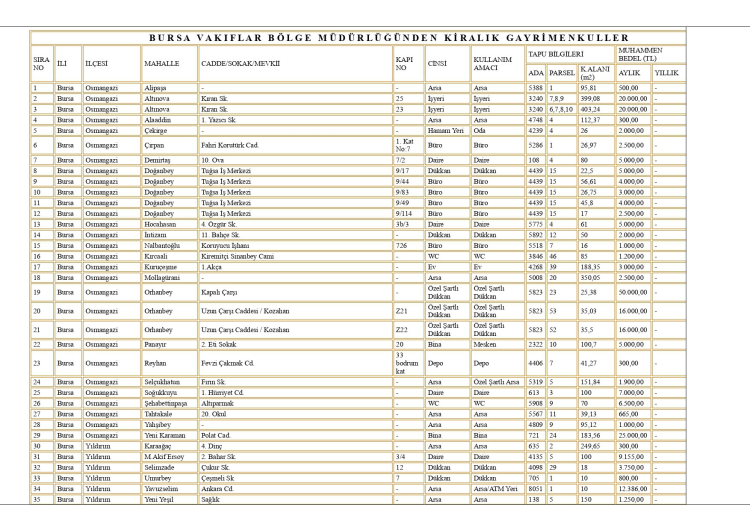 Bursa Vakıflar Bölge Müdürlüğü, arsa, tarla, işyeri, hamam, daire, dükkan, büro, wc, bina ve depolardan oluşan onlarca taşınmazı kiraya vermek için ihale açtı.