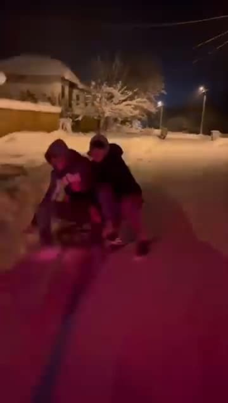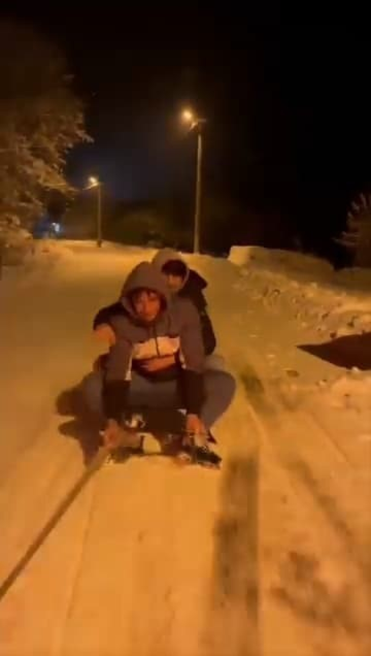 Belediye ekipleri yolda tuzlama yaptı. Çocuklar kartopu oynarken, bazıları da aracın arkasında bağladığı kızak ile kayak yaptılar.