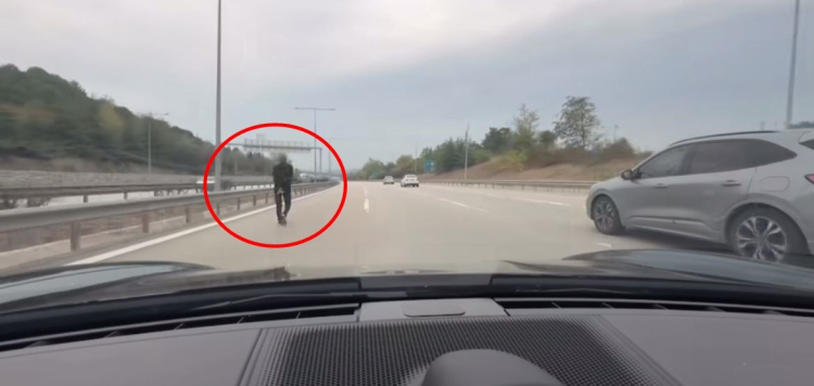 Bursa'da otoyolun sol şeridinden yürüyen yaya, kendisini fark eden otomobil sürücüsünün manevrası sayesinde kurtuldu. O anlar, araç kamerasına yansıdı.