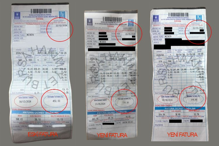 Ocak-Şubat ayında kesilen bir faturada 17 metreküp su için 450 TL istenirken, bu ay kesilen faturalarda 16 metreküp suyun bedelinin 375 TL , 21 metreküp suyun 505 TL olduğu görüldü.
