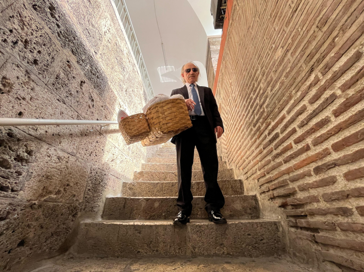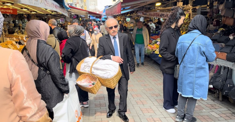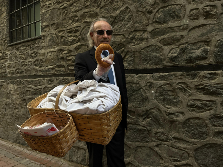 Bursa'da takım elbisesi ve boyalı kunduralarıyla tarihi çarşıları dolaşıp simit satıyor