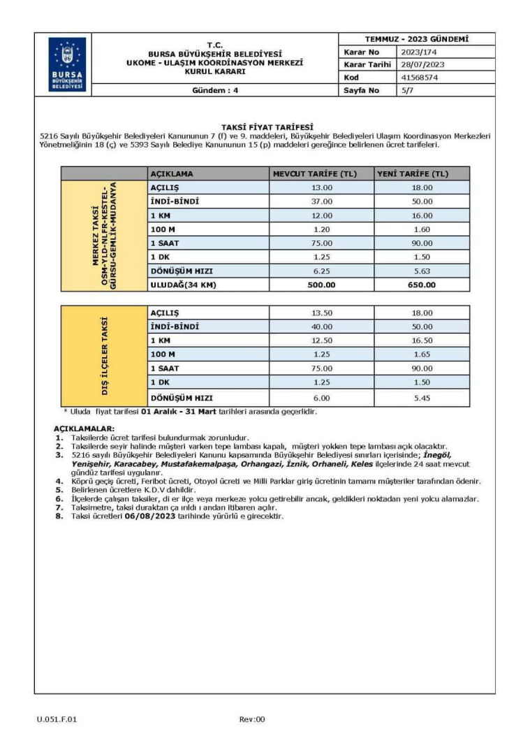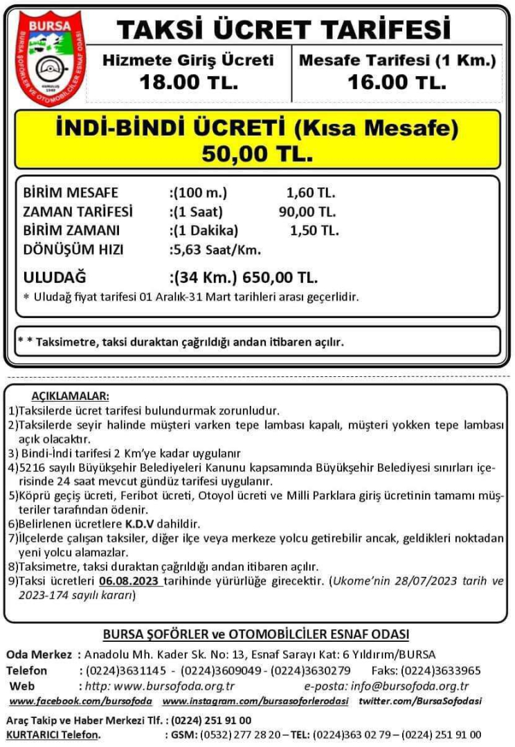 Öte yandan Bursa Şoförler ve Otomobilciler Esnaf Odası tarafından son olarak 2023 Haziran ayında yapılan yazılı açıklamada, taksilerde yeni ücret tarifesi paylaşılmıştı.
