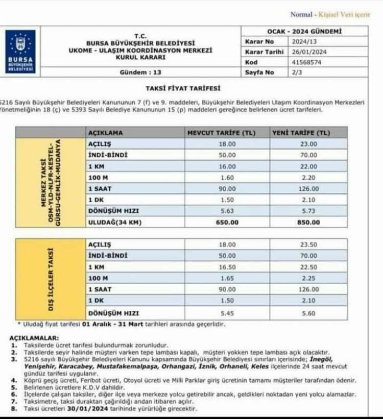 İŞTE BURSA'DAKİ YENİ TAKSİ ÜCRET TARİFESİ: