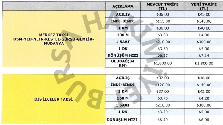 Bursa’da 36 lira olan açılış ücreti 45 lira, indi-bindi ücreti ise 115 liradan 140 liraya yükseldi.