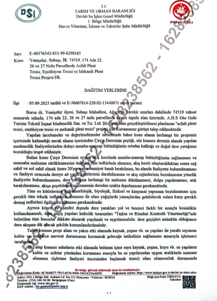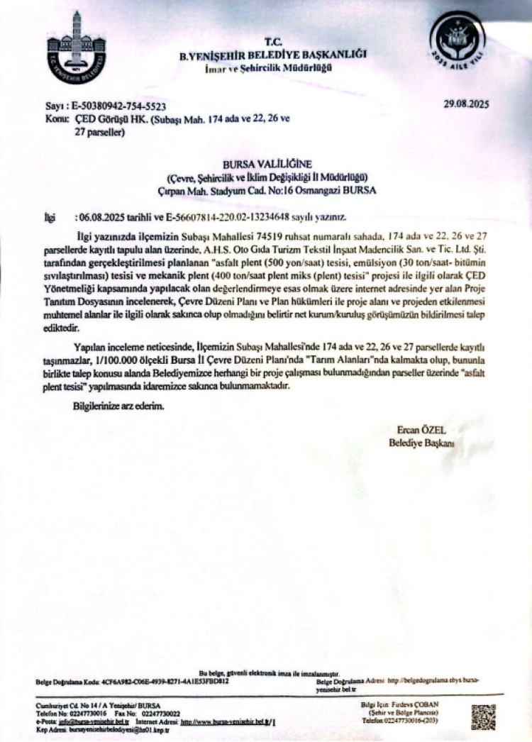 Başvuru sonrası yapılan açıklamada, "Bursa ili Yenişehir ilçesi Subaşı Mahallesi, Ağaçtepe mevkiinde, 74519 ruhsat numaralı sahada, 174 ada ve 22, 26 ve 27 parsel mevkiindeki A.H.S. Oto Gıda Turizm Tekstil İnşaat Madencilik Sanayi ve Ticaret Limited Şirketi tarafından yapılması planlanan Asfalt Plent (500 Ton/Saat) Tesisi, Emülsiyon (30 Ton/Saat-Bitümün Sıvılaştırılması) Tesisi, Mekanik Plent (400 Ton/Saat Plent Miks/Pmt) Tesisi projesi ile ilgili olarak Bursa Valiliğimize sunulan P.T.D. Dosyası Çevresel Etki Değerlendirmesi Yönetmeliği'nin 16. maddesi doğrultusunda incelenmiş ve projeye ilişkin ÇED Süreci başlamıştır. İlgililere ve kamuoyuna duyurulur." ifadeleri kullanıldı.