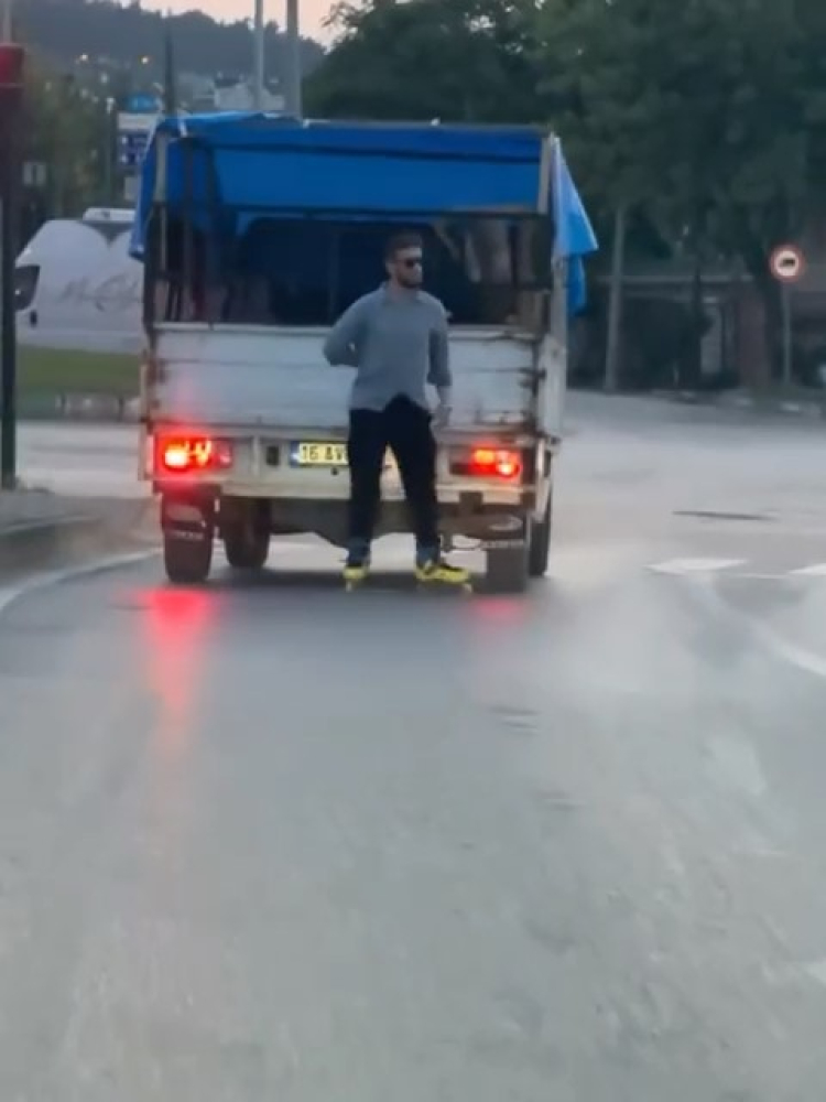 Patenle seyahat eden bir genç, önünde seyir halinde olan kamyonetin arkasına tutunarak ilerlemeye başladı.