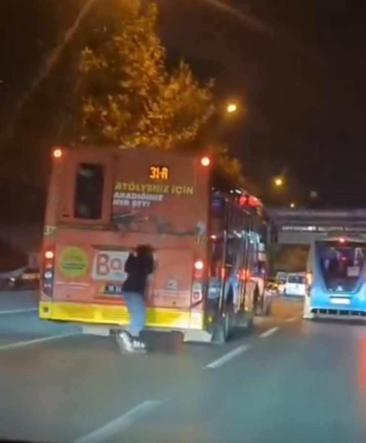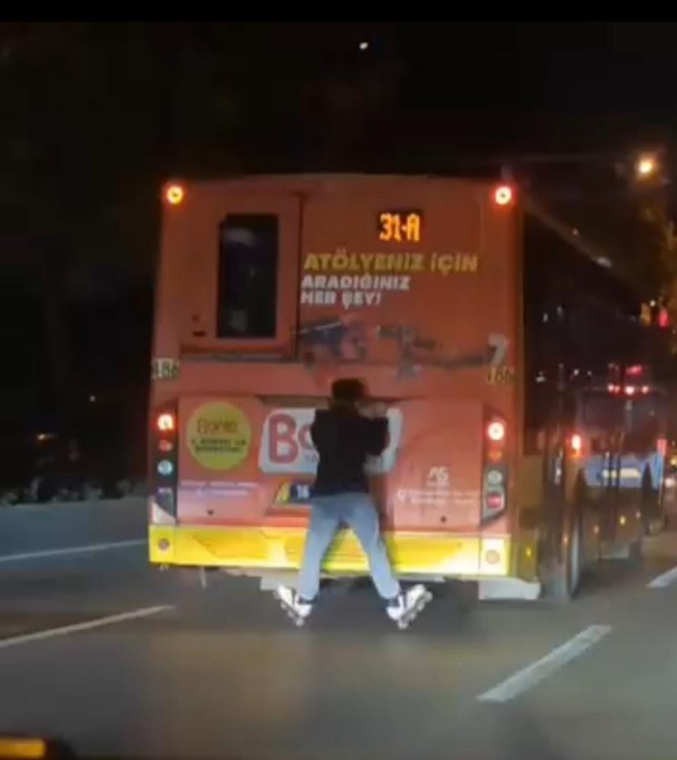 Seyir halindeki otobüsün arka bölümüne tutunarak patenle ilerleyen genç, uzun süre bu şekilde yolculuk yaptı.
