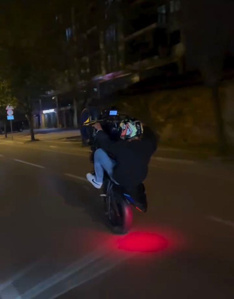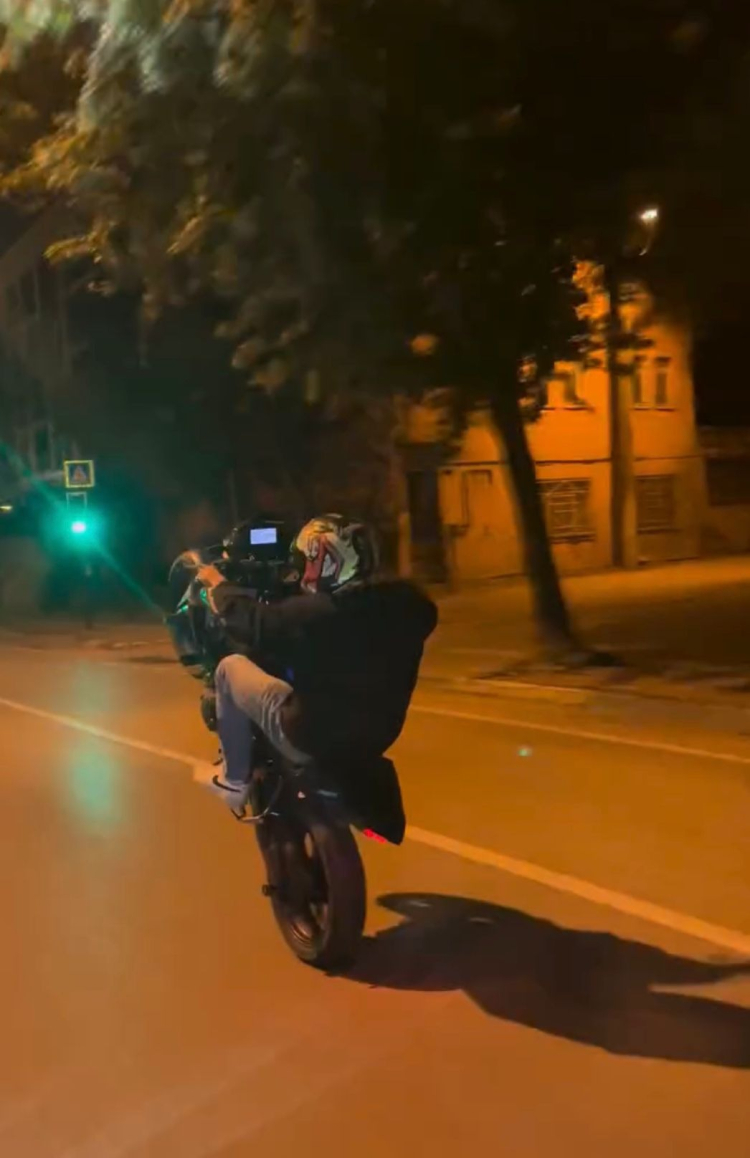 Yıldırım ilçesinde gece saatlerinde plakasız motosikleti ile tek teker üzerinde ilerleyen sürücü, trafiği tehlikeye attı.