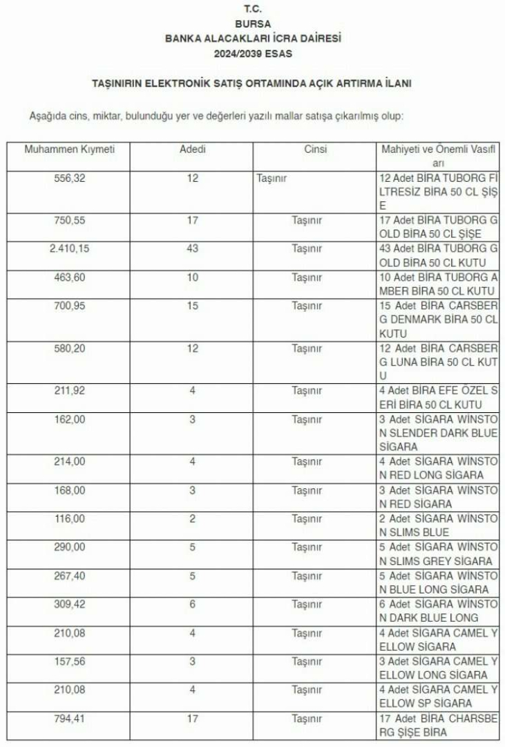İcra memurları tarafından el konulan çok sayıda alkollü içeçek, 12 bin 536 TL'den başlayan açık artırma ile satılacak.