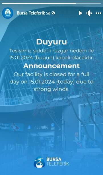 Bursa Teleferik AŞ'den yapılan açıklamada, bölgedeki şiddetli rüzgar nedeniyle teleferiğin tam gün kapalı olacağı duyuruldu.