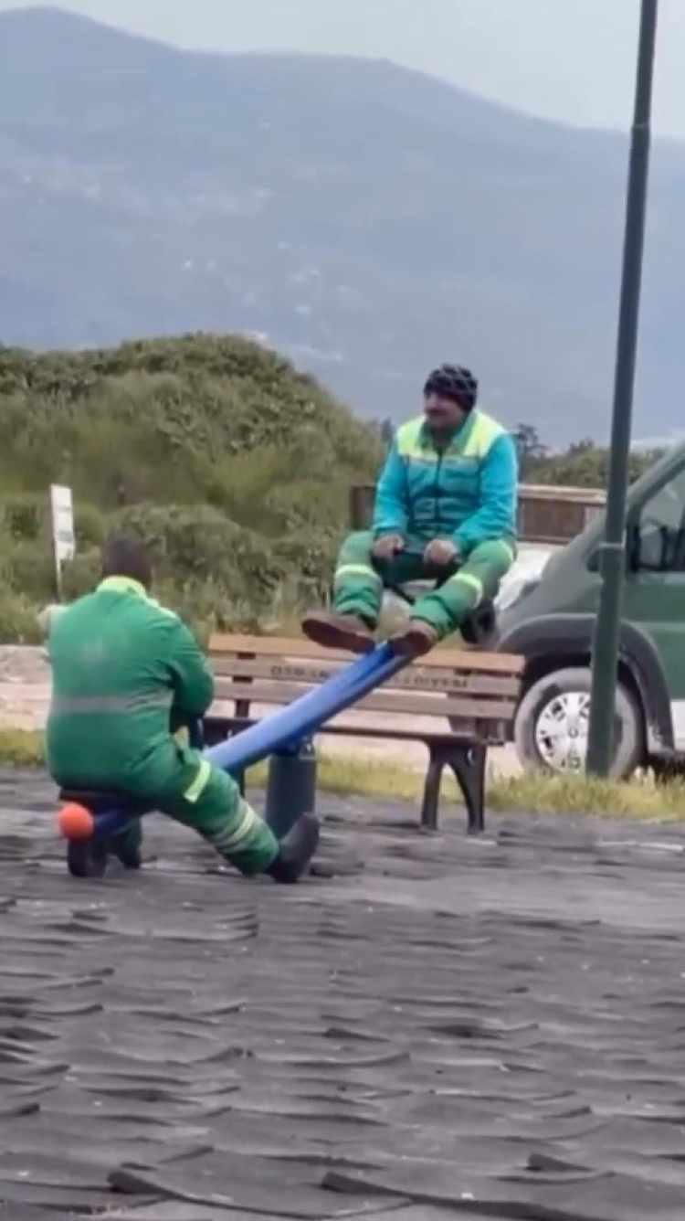 Bursa'da görev yapan belediye temizlik işçilerinin iş arası verdikleri kısa molada tahterevalliye binerek sergiledikleri samimi görüntüler gündem oldu.