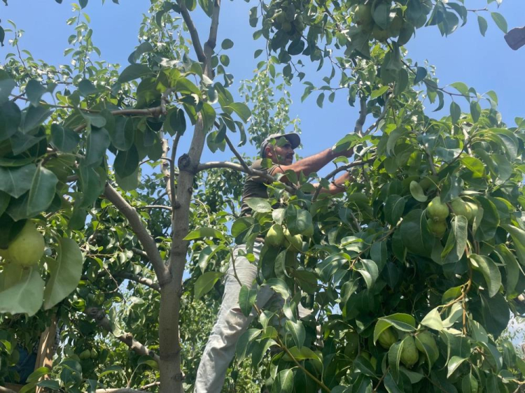 "Hasat öncesi bahçelerde en önemli çalışmalardan birin yapıyoruz. Seyreltme ya da tekleme denen bu çalışmada topak halindeki armutlardan soğuk pası ve kara leke olanları, küçükleri ayırıp, koparıp yere atıyoruz. Şeftalide de yan yana bulunan olgunlaşmamış meyvelerden bazıları koparıp uzaklaştırıyoruz. Bunun için tarım işçileri getiriliyor. Sabah 07.00'de bahçeye geliyorlar akşam 17.00'ye kadar çalışıyorlar."