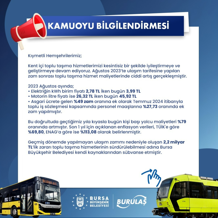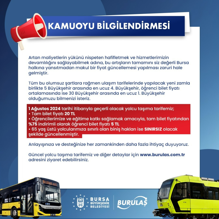 Artan maliyetlerin yükünü nispeten haf ifletmek ve hizmetlerimizin devamlılığını sağlayabilmek adına, bu araçların tamamını siz değerli Bursa halkına yansıtmadan makul bir fiyat güncellemesi yapılması zaruri hale gelmiştir. Tüm bu olumsuz şartlara rağmen ulaşım tarifelerinde yapılacak yeni zamla birlikte 5 Büyükşehir arasında en ucuz 4. Büyükşehir, Öğrenci bilet fiyatı ortalarnosındo ise 30 Büyükşehir arasında en ucuz I. Büyükşehir olduğumuzu bilmenizi isteriz.