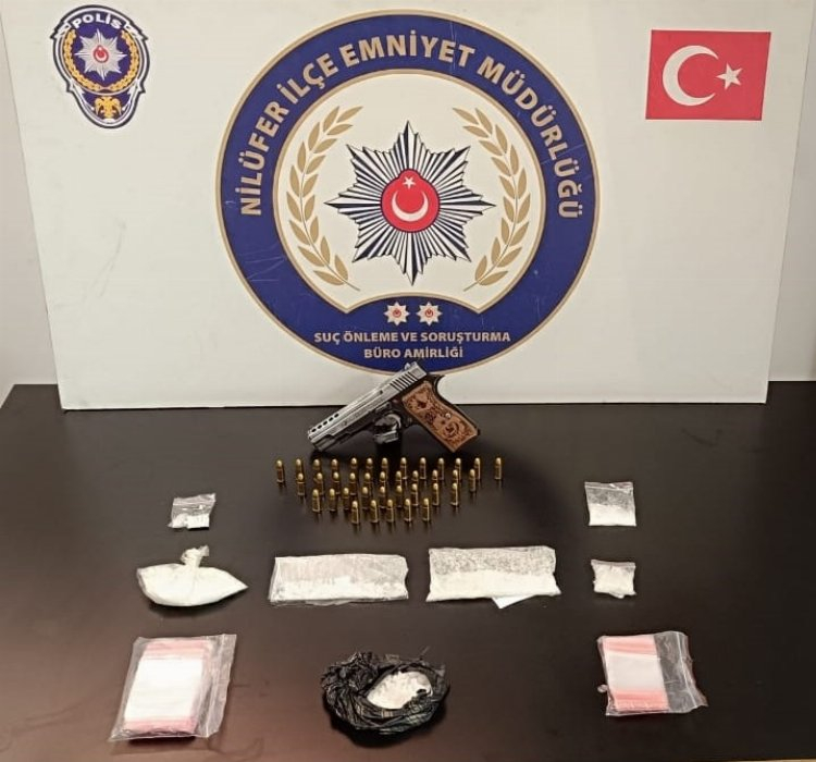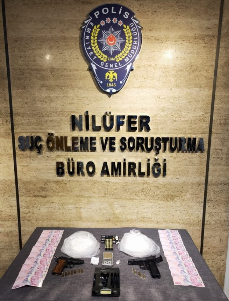 Bursa'da, 2 adrese eş zamanlı olarak düzenlenen operasyonda 1 kilo 300 gram metamfetamin ve 3 adet ruhsatsız tabanca ele geçirildi. Operasyonda gözaltına alınan 3 kişi çıkarıldığı mahkemece tutuklanarak cezaevine gönderildi.