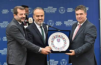 Gürsu Şoförler Odası Başkanı Recep Kaya günün anısına Büyükşehir Belediye Başkanı Alinur Aktaş’a ve Gürsu Belediye Başkanı Mustafa Işık’a hediye takdim etti.